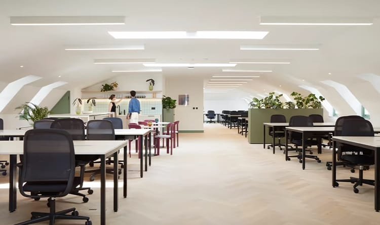 Bloomsbury House at 74 - 77 Great Russell Street is a modern workspace designed for collaboration and connectivity. This location in Holborn is set within elegant Georgian townhouses that have been revitalised to meet contemporary business needs. You’ll find a mix of private offices and shared workspaces, all featuring high ceilings and large windows that bring in ample natural light. The interior combines historic charm with functional design, offering communal kitchens, breakout areas, and stylish meeting rooms. A calming courtyard garden adds a touch of greenery, providing a pleasant escape during busy workdays.